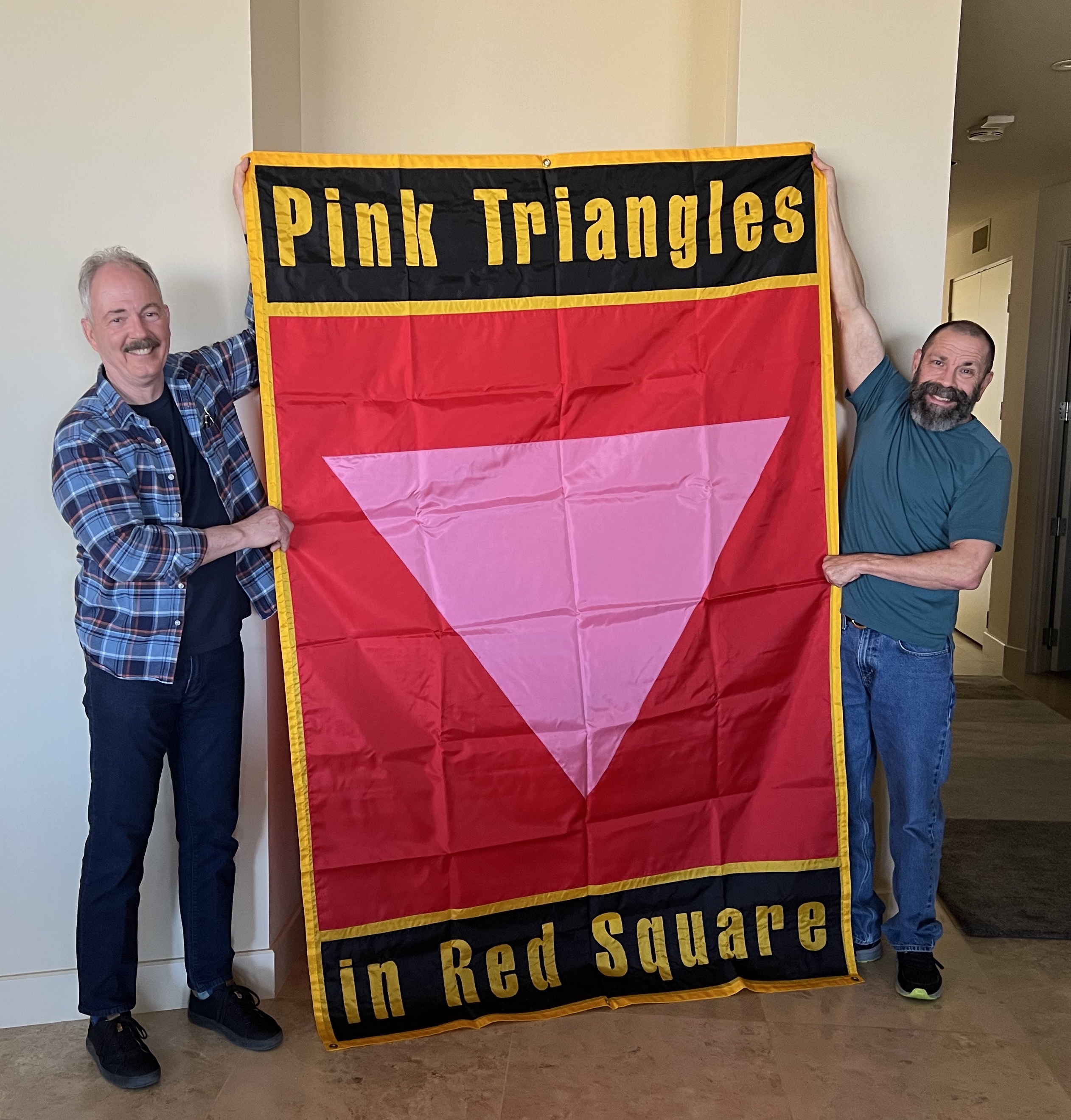 March 2023 picture of John Paul and Andy Shore holding up the banner that was taken to Russia and Latvia in 1993.